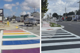 This combination of photos shows a rainbow crosswalk that was removed overnight Thursday, Aug. 21, 2025, outside of the Pulse nightclub, where 49 people were gunned down in June 2016, in Orlando, Fla. The lefthand image shows the crosswalk in 2017. (Ryan Gillespie/Orlando Sentinel via AP)