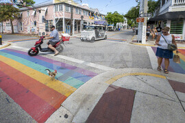 FILE - The state of Florida is demanding that the rainbow crosswalks at the intersection of Duval and Petronia streets in Key West, Fla., seen here on Aug. 18, 2025, be removed by Sept. 3, 2025, or face removal by the state at the city's expense. (Rob O'neal/The Key West Citizen via AP, file)
