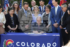 FILE - Colorado Gov. Jared Polis, front center, signs bills into law to bring more comprehensive guidelines into place for funeral facilities on May 24, 2024, during a ceremony outside the Governor's mansion in downtown Denver. (AP Photo/David Zalubowski, File)