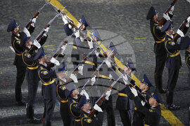 Members of The Honor Guard Unit of the Central Military Commandant's Office of The Russian National Guard show a fragment from the historic 1945 Victory Parade on Red Square during a dress rehearsal of the Spasskaya Tower International Military Music Festival on the Red square in Moscow, Thursday, Aug. 21, 2025. (AP Photo/Alexander Zemlianichenko)