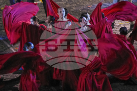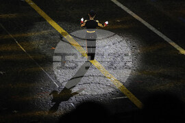 Actors perform during a dress rehearsal of the Spasskaya Tower International Military Music Festival in Red Square in front of the St. Basil Cathedral and the Spasskaya Tower in Moscow, Russia, Thursday, Aug. 21, 2025. (AP Photo/Alexander Zemlianichenko)