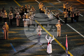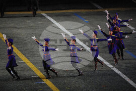 Actors perform during a dress rehearsal of the Spasskaya Tower International Military Music Festival on the Red Square in Moscow, Thursday, Aug. 21, 2025. (AP Photo/Alexander Zemlianichenko)