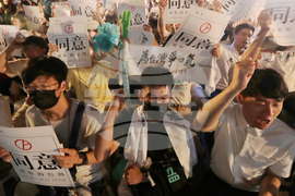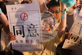 People hold signs reading ''Approval'' to support a referendum held in favor of extending the operation of the third nuclear power plant in Taipei, Taiwan, Friday, Aug. 22, 2025. (AP Photo/Chiang Ying-ying)