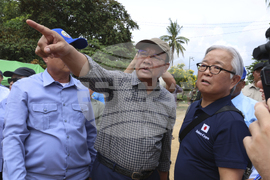 In this photo released by Agence Kampuchea Press (AKP), Cambodian Minister of Foreign Affairs and International Cooperation, Prak Sokhonn, center, gestures with Japanese Ambassador to Cambodia Ueno Atsushi, right, during a tour visit at the border site of Thai military laid barbed wire and placed tyres to seize Cambodian homes and farmland, in O'Bei Choan Commune, Banteay Meanchey province near Cambodia-Thailand border, Friday, August. 22, 2025. (AKP via AP)