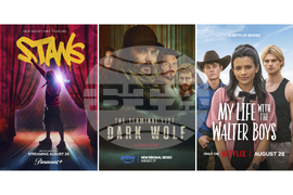 This combination of images show promotional art for "Stans," a documentary about a cast of superfans of Eminem, left, the series "The Terminal List: Dark Wolf," and "My Life with the Walter Boys." (Paramount+/Prime/Netflix via AP)
