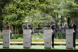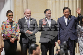 Leaders, from left, Ecuador's Vice President Maria Jose Pinto, Brazil's President Luiz Inacio Lula da Silva, Colombia's President Gustavo Petro, and Bolivia's President Luis Arce wave during a meeting of leaders of the Amazon Cooperation Treaty Organization in Bogota, Colombia, Friday, Aug. 22, 2025. (AP Photo/Fernando Vergara)