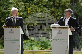 Brazil's President Luiz Inacio Lula da Silva, let, and Colombia's President Gustavo Petro atone a meeting of leaders of the Amazon Cooperation Treaty Organization in Bogota, Colombia, Friday, Aug. 22, 2025. (AP Photo/Fernando Vergara)