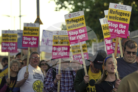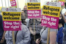 Protesters hold banners and placards during a demonstration in Orpington near London, Friday, Aug. 22, 2025 as the dilemma of how to house asylum-seekers in Britain got more challenging for the government after a landmark court ruling this week motivated opponents to fight hotels used as accommodation.(AP Photo/Alberto Pezzali)