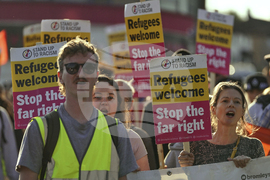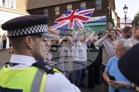 Protesters attend a demonstration in Orpington near London, Friday, Aug. 22, 2025 as the dilemma of how to house asylum-seekers in Britain got more challenging for the government after a landmark court ruling this week motivated opponents to fight hotels used as accommodation.(AP Photo/Alberto Pezzali)