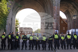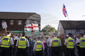 Police officers guard a demonstration in Orpington near London, Friday, Aug. 22, 2025 as the dilemma of how to house asylum-seekers in Britain got more challenging for the government after a landmark court ruling this week motivated opponents to fight hotels used as accommodation.(AP Photo/Alberto Pezzali)