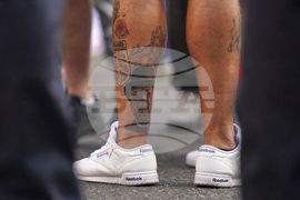 A protester shows a tattoo with a Winston Churchill portrait on his leg during a demonstration in Orpington near London, Friday, Aug. 22, 2025 as the dilemma of how to house asylum-seekers in Britain got more challenging for the government after a landmark court ruling this week motivated opponents to fight hotels used as accommodation.(AP Photo/Alberto Pezzali)