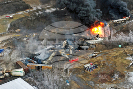 FILE - In this photo taken with a drone, portions of a Norfolk Southern freight train that derailed in East Palestine, Ohio, remain on fire, Feb. 4, 2023. (AP Photo/Gene J. Puskar, File)