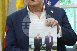 President Donald Trump holds a photo of himself with Russian President Vladimir Putin during an announcement in the Oval Office of the White House, Friday, Aug. 22, 2025, in Washington. (AP Photo/Jacquelyn Martin)