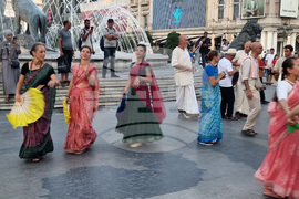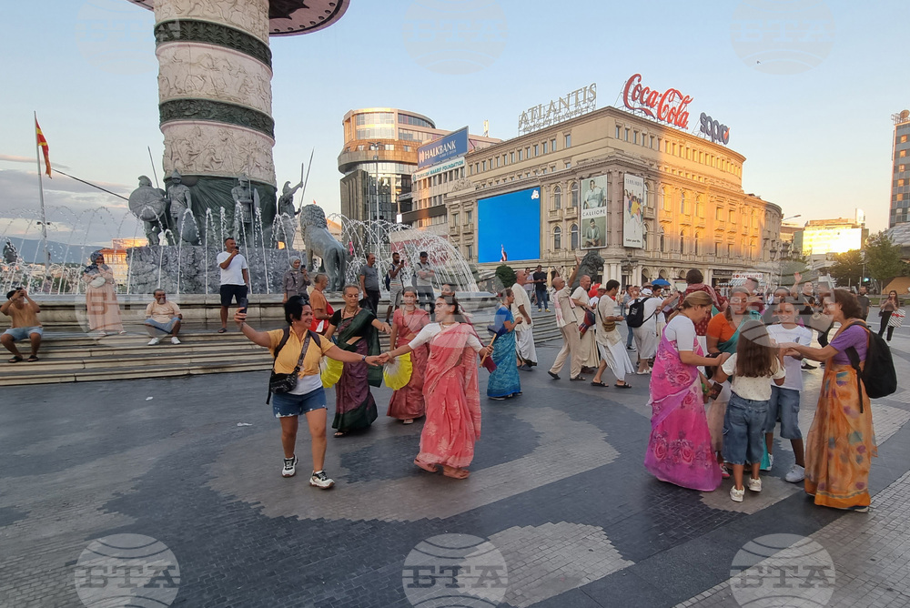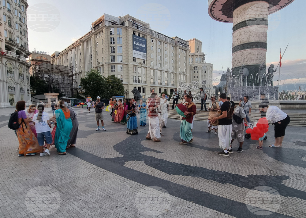 Скопие (22 август 2025) Ансамбъл "The tavelling monk" изнася представление на централния площад в Скопие, Република Северна Македония.