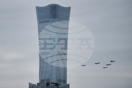 A Chinese J-16 fighter jet leads the J-20 and J-35A stealth fighter jets as they fly past the capital city tallest skyscraper China Zun Tower and office buildings in the central business district during a rehearsal ahead of the Sept. 3 military parade to commemorate the 80th anniversary of Japan's World War II surrender, in Beijing, Sunday, Aug. 24, 2025. (AP Photo/Andy Wong)