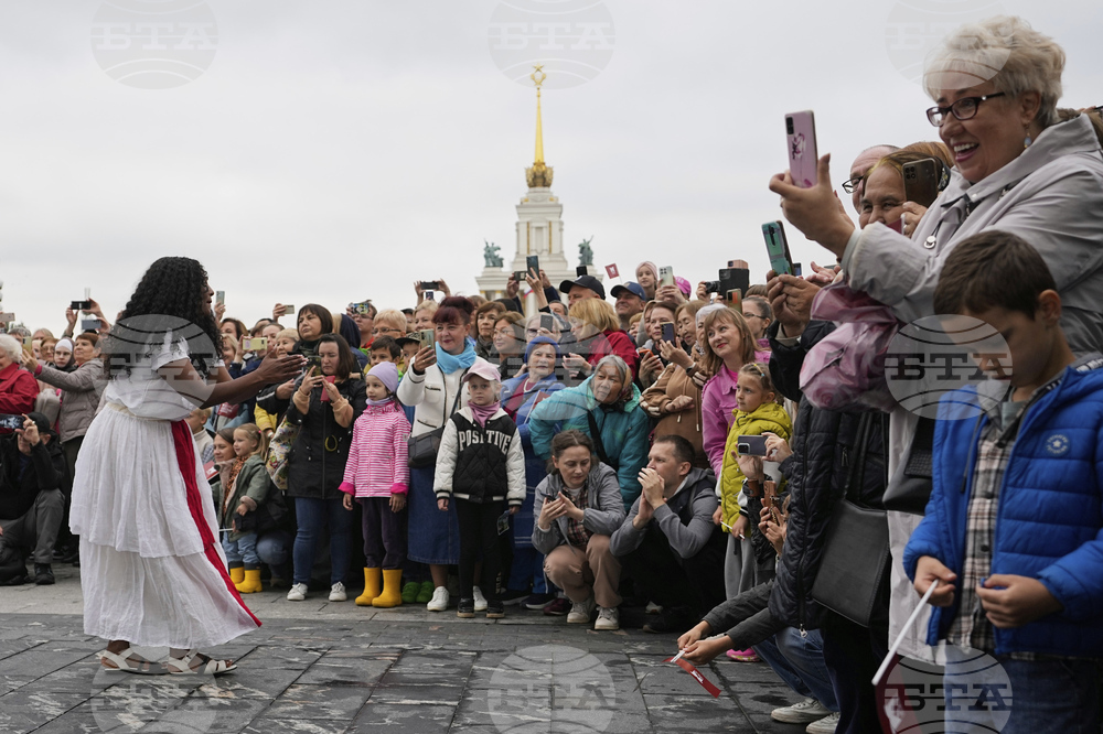 Members of the Zimbabwe Defense Forces Band perform in front of the historical main gates of VDNKh, The Exhibition of Achievements of National Economy, during the Spasskaya Tower International Military Music Festival in Moscow, Russia, Saturday, Aug. 23, 2025. (AP Photo/Pavel Bednyakov)