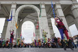 Italian Historic Flag-Weavers of the Contrade of Cori perform in front of the historical main gates of VDNKh, The Exhibition of Achievements of National Economy, during the Spasskaya Tower International Military Music Festival in Moscow, Russia, Saturday, Aug. 23, 2025. (AP Photo/Pavel Bednyakov)