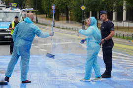 Polish activists cover the street with paint in the national colours of Ukraine - blue and yellow, in front of the Russian Embassy in Warsaw, in a gesture of solidarity with the Ukrainian nation on the Day of National Flag of Ukraine, in Warsaw, Poland, Saturday, Aug. 23, 2025. (AP Photo/Czarek Sokolowski)