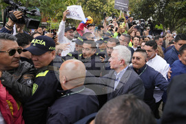 Former Colombian President Alvaro Uribe arrives to visit the site where presidential hopeful and Sen. Miguel Uribe Turbay was fatally shot during a political rally in Bogota, Colombia, Saturday, Aug. 23, 2025. (AP Photo/Fernando Vergara)