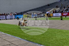 A corgi prepares to race during a international event Corgi Race Vilnius 2025 in Vilnius, Lithuania, Saturday, Aug. 23, 2025. (AP Photo/Mindaugas Kulbis)