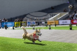 A Corgi runs during a international event Corgi Race Vilnius 2025 in Vilnius, Lithuania, Saturday, Aug. 23, 2025. (AP Photo/Mindaugas Kulbis)
