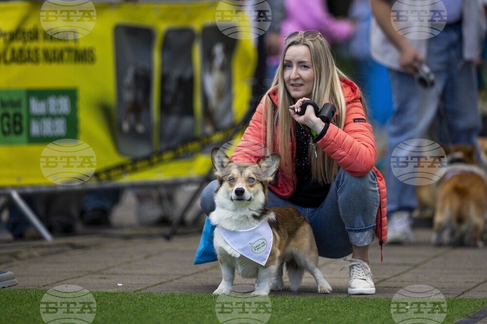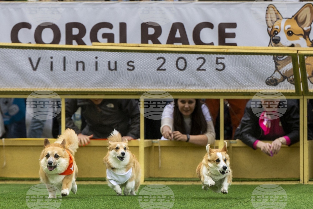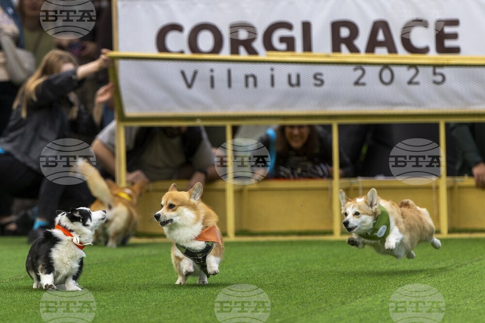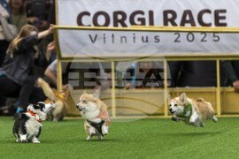 Corgis race during the Corgi Race Vilnius 2025 event in Vilnius, Lithuania, Saturday, Aug. 23, 2025. (AP Photo/Mindaugas Kulbis)
