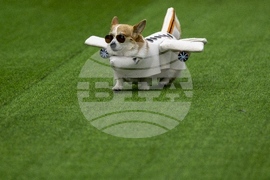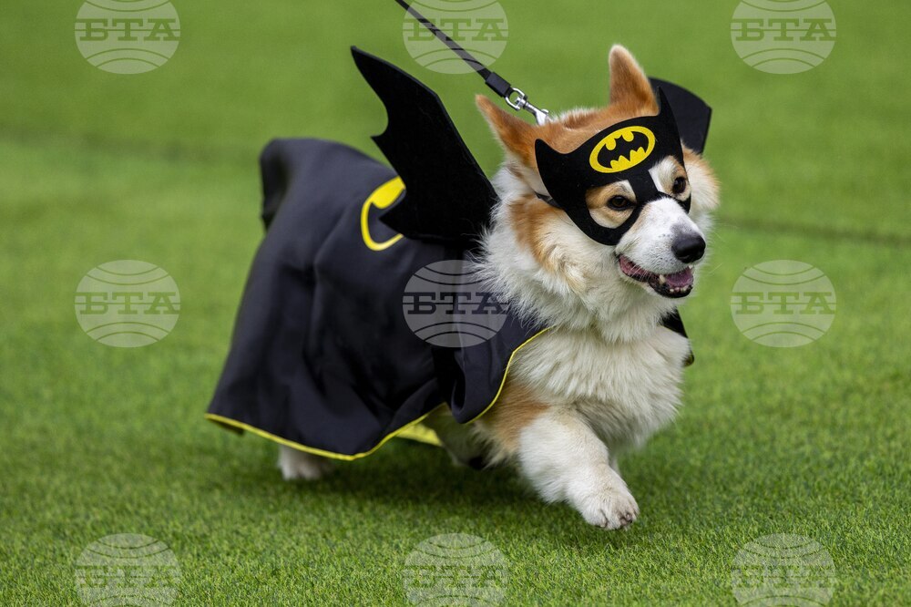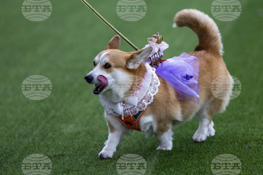 A corgi dog participates in a fashion show during a international event Corgi Race Vilnius 2025 in Vilnius, Lithuania, Saturday, Aug. 23, 2025. (AP Photo/Mindaugas Kulbis)