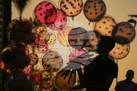 A Syrian boy sells balloons as the sun sets over the Mediterranean waterfront promenade in Beirut, Lebanon, Saturday, Aug. 23, 2025. (AP Photo/Bilal Hussein)