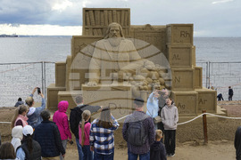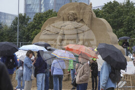 People walk past a sand sculpture of Grand Prince Alexander Nevsky, canonized in Russian Orthodox Church, at a sand sculpture exhibition named "City of Winners" that depicts significant moments in Russian history, in St. Petersburg, Russia, Saturday, Aug. 23, 2025. (AP Photo/Dmitri Lovetsky)