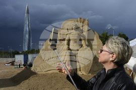 People visit a sand sculpture exhibition named "City of Winners" that depicts significant moments in Russian history, in St. Petersburg, Russia, Saturday, Aug. 23, 2025. (AP Photo/Dmitri Lovetsky)