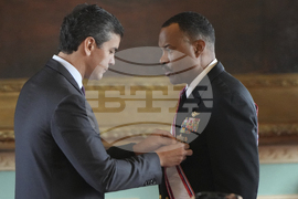 Paraguay's President Santiago Peña awards the Order of Merit “Gral Div Bernardino Caballero” in the grade of “Gran Cross”, to Navy Adm. Alvin Holsey, commander of US Southern Command, at Government Palace in Asuncion, Paraguay, Saturday, Aug. 23, 2025. (AP Photo/Jorge Saenz)
