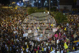 People take part in a protest demanding the end of the war and immediate release of hostages held by Hamas in the Gaza Strip, and against Prime Minister Benjamin Netanyahu's government in Tel Aviv, Israel, Saturday, Aug. 23, 2025. (AP Photo/Ohad Zwigenberg)