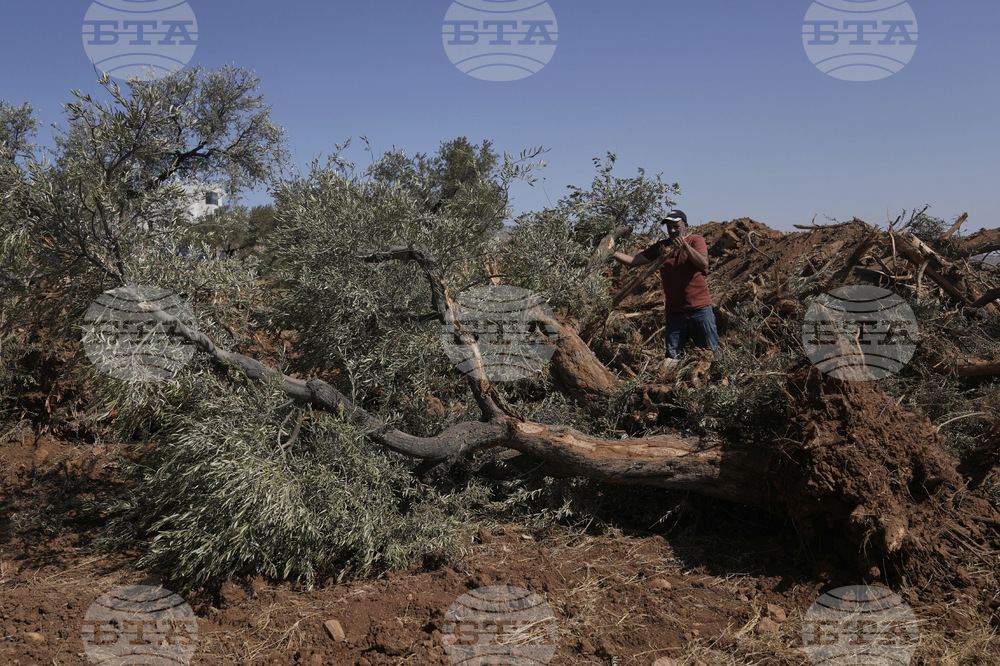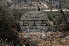 A Palestinian man walks past uprooted olive trees and razor wires placed by Israeli soldiers following a military raid in the West Bank village of Al-Mughayyir, Sunday, Aug. 24, 2025. (AP Photo/Majdi Mohammed)