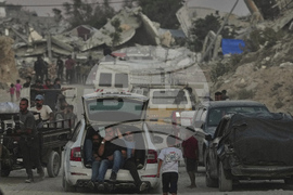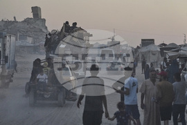 Displaced Palestinians travel on a car past buildings destroyed during Israeli air and ground operations, in Gaza City, Saturday, Aug. 23, 2025. (AP Photo/Jehad Alshrafi)