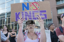 A demonstrator protest against President Donald Trump's use of federal law enforcement and National Guard troops in the city during a rally along the U street corridor in northwest Washington, Saturday, Aug. 23, 2025. (AP Photo/Jose Luis Magana)