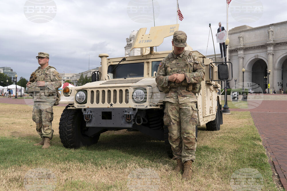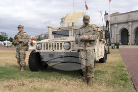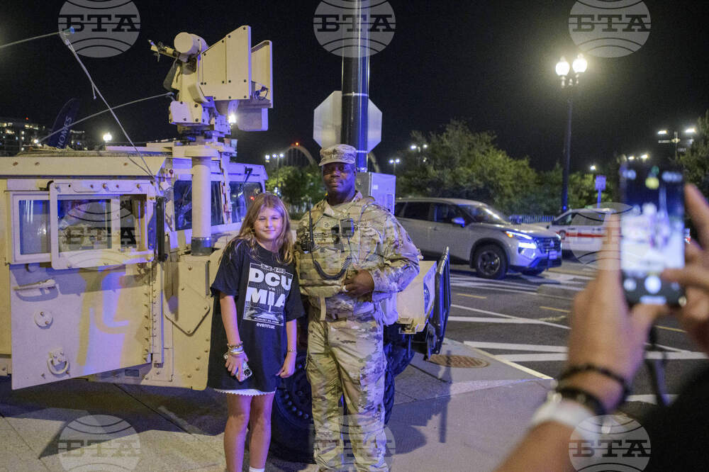 Members of the District of Columbia National Guard pose for photos with the public across from Audi Field following an MLS soccer game between D.C. United and Inter Miami CF in Washington, Saturday, Aug. 23, 2025. (AP Photo/Rod Lamkey, Jr.)