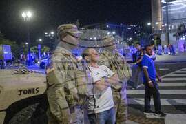 A man poses with members of the District of Columbia National Guard across from Audi Field following an MLS soccer game between D.C. United and Inter Miami CF in Washington, Saturday, Aug. 23, 2025. (AP Photo/Rod Lamkey, Jr.)