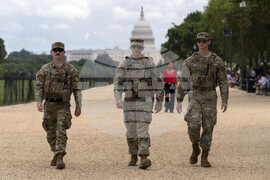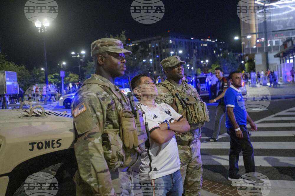 Members of the District of Columbia National Guard are positioned across the street from Audi Field during an MLS soccer game between D.C. United and Inter Miami CF in Washington, Saturday, Aug. 23, 2025. (AP Photo/Rod Lamkey, Jr.)