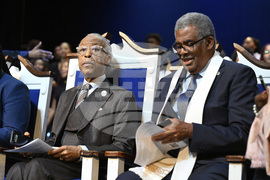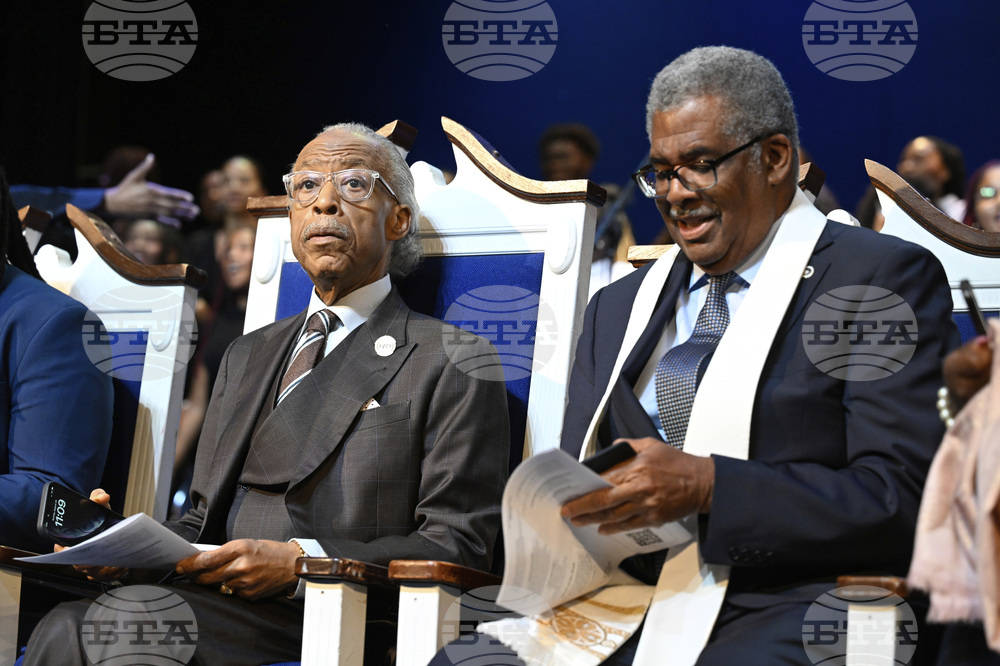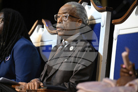 Rev. Al Sharpton, left, seated next to Rev. Bernard L. Richardson, listens before delivering a sermon at Howard University's Cramton Auditorium, Sunday, Aug. 24, 2025, in Washington, to announce a national drive in support of District of Columbia Mayor Muriel Bowser, as President Donald Trump's administration continues it's use of federal law enforcement and National Guard troops in the city. (AP Photo/John McDonnell)