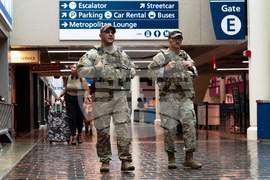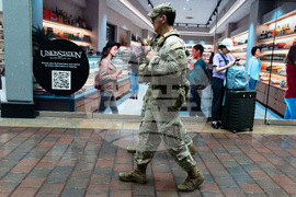 A member of the District of Columbia National Guard sits positioned across from Audi Field during an MLS soccer game between D.C. United and Inter Miami CF in Washington, Saturday, Aug. 23, 2025. (AP Photo/Rod Lamkey, Jr.)