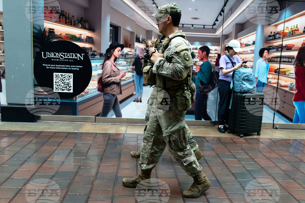 Members of the South Carolina National Guard patrol Union Station, Sunday, Aug. 24, 2025, in Washington. (AP Photo/Jose Luis Magana)