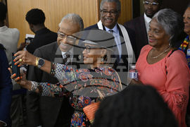 Rev. Al Sharpton, left, greets attendees after delivering a sermon at Howard University's Cramton Auditorium, Sunday, Aug. 24, 2025, in Washington, to announce a national drive in support of District of Columbia Mayor Muriel Bowser, as President Donald Trump's administration continues it's use of federal law enforcement and National Guard troops in the city. (AP Photo/John McDonnell)