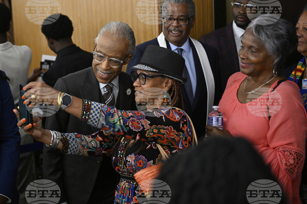 Rev. Al Sharpton, center, greets attendees after delivering a sermon at Howard University's Cramton Auditorium, Sunday, Aug. 24, 2025, in Washington, to announce a national drive in support of District of Columbia Mayor Muriel Bowser, as President Donald Trump's administration continues it's use of federal law enforcement and National Guard troops in the city. (AP Photo/John McDonnell)