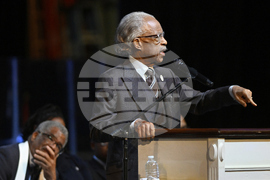 Rev. Al Sharpton delivers a sermon as Rev. Bernard L. Richardson listens at Howard University's Cramton Auditorium, Sunday, Aug. 24, 2025, in Washington, to announce a national drive in support of District of Columbia Mayor Muriel Bowser, as President Donald Trump's administration continues it's use of federal law enforcement and National Guard troops in the city. (AP Photo/John McDonnell)