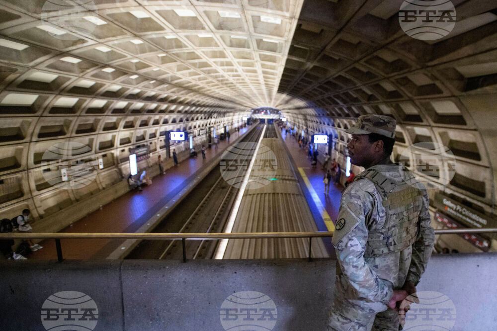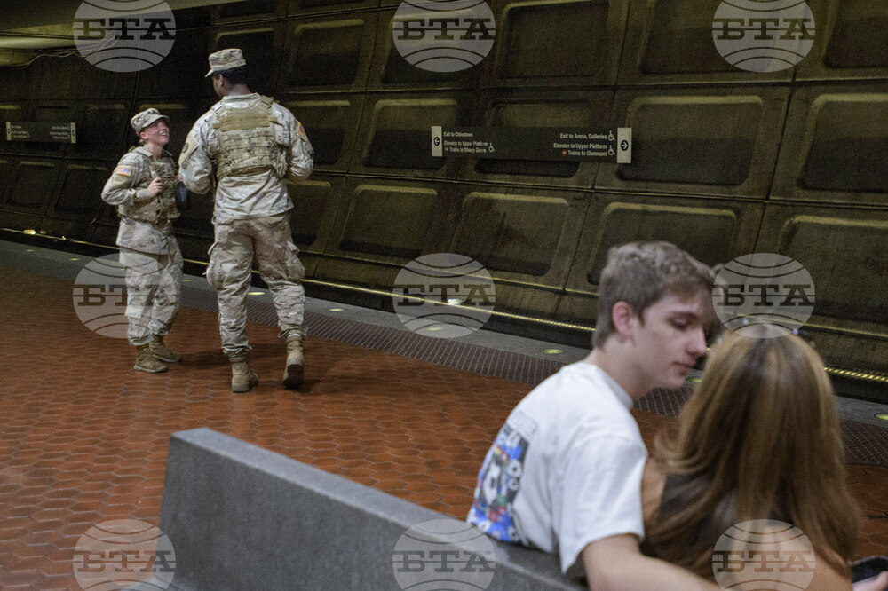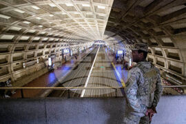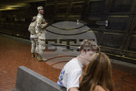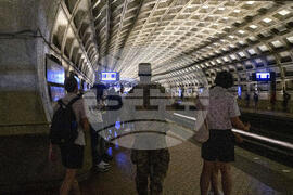 Members of the South Carolina National Guard patrol the platform of the Washington Metro Gallery Place station in Washington, Sunday, Aug. 24, 2025. (AP Photo/Rod Lamkey, Jr.)