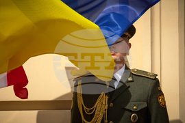 A Ukrainian soldier stands guard during welcome ceremony for Canadian Prime Minister Mark Carney in Kyiv, Ukraine, Sunday, Aug. 24, 2025. (AP Photo/Efrem Lukatsky)