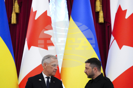 Canadian Prime Minister Mark Carney and Ukrainian President Volodymyr Zelenskyy take part in a signing ceremony at Mariinskyi Palace in Kyiv, Ukraine on Sunday, Aug. 24, 2025. (Sean Kilpatrick/The Canadian Press via AP)