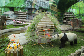 Giant panda Katyusha enjoys her birthday treats during the second birthday party at the zoo in Moscow, Sunday, Aug. 24, 2025. (Vasil Kuzmichonak/Moscow News Agency via AP)