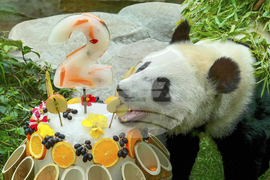 Giant panda Katyusha enjoys her birthday cake during the second birthday party at the zoo in Moscow, Sunday, Aug. 24, 2025. (Vasil Kuzmichonak/Moscow News Agency via AP)
