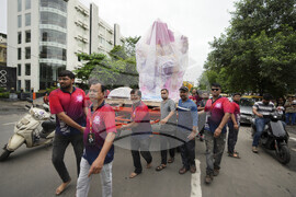 Devotees carry an idol of the elephant-headed Hindu god Ganesha, covered with plastic sheet to protect from rain, to a worship venue for the upcoming Ganesh Chaturthi festival, in Ahmedabad, India, Sunday, Aug. 24, 2025. (AP Photo/Ajit Solanki)